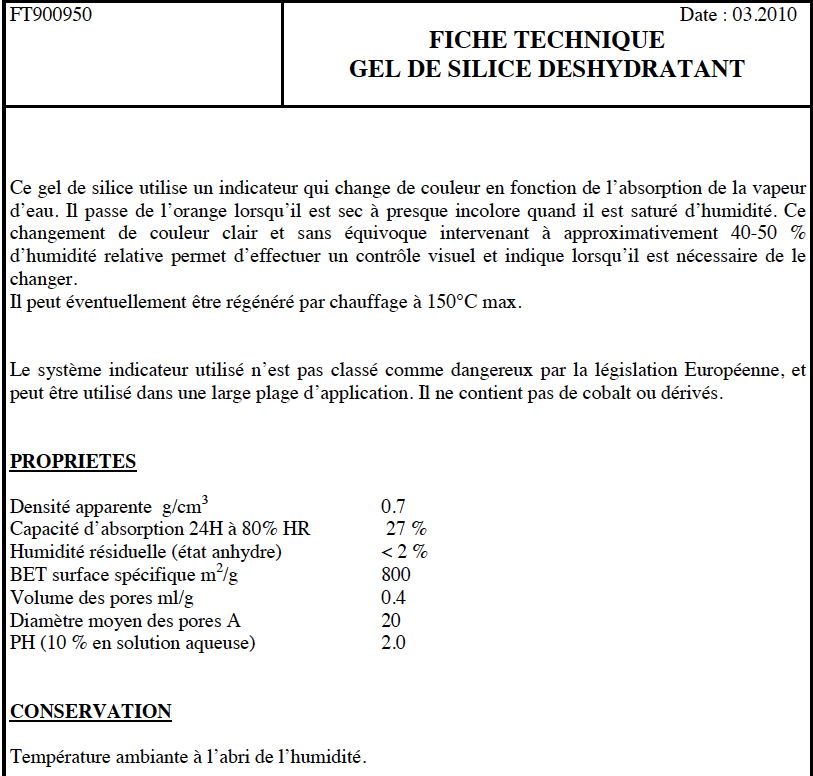 Grains de 2.5 à 6mm passant de l'orange à l'état sec à presque incolore à l'état humide ( environ 40 à 50% d'humidité relative )